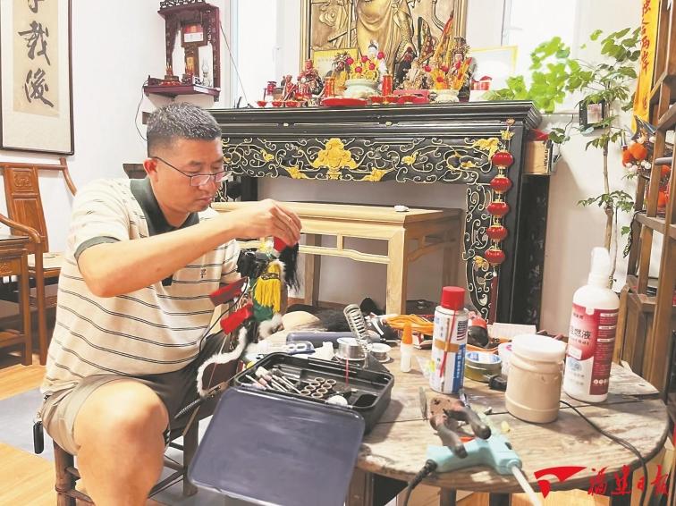 陳銀龍在展示變臉木偶。何祖謀 攝 “普法哥”的創新 除了有非遺傳承人這個身份,陳銀龍還是福建省“蒲公英”普法志愿者、東山縣法律明白人。 能不能把普法工作和非遺傳承聯系起來?陳銀龍開始了大量的探索。 “法律條文復雜晦澀,普法工作亟需創新接地氣、聚人氣、有生氣的宣傳形式,調動群眾學法用法的積極性和參與。”陳銀龍思考著。與此同時,觀眾大多反饋傳統鐵枝木偶戲節奏慢、時代遠、故事情節單一,“看得快睡著了”。 由此,陳銀龍下決心創新傳統鐵枝木偶戲的表演形式,先是融入京劇唱法,后又增加變臉、噴火等特技,將戲推向高潮,寓教于樂,讓法治正能量理念“植”入心間。 陳銀龍回憶,讓木偶戲增加變臉、噴火等特技的靈感來自川劇。“在一次參加好友的婚宴時,看著川劇師傅在表演變臉噴火,我越看越覺得有滋味,回到家中一夜未眠。”他當時便琢磨:若能將變臉噴火的絕技融入鐵枝木偶,再配上京劇唱腔,表演將會更加豐富多彩。 最初,陳銀龍嘗試用修表的吹耳球接上導管,吸入汽油后從木偶口中噴出。“雖說火苗不小,可火勢根本沒法控制,稍不留意就會燒壞偶頭。”后來他改在木偶體內綁上特制的一次性打火機,卻又遭遇新難題——木偶戲常在露天演出,風一吹火就滅了。