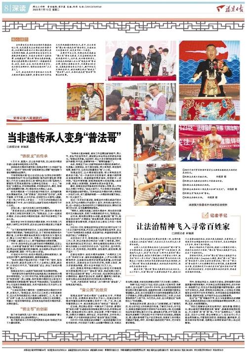 《福建日報》2025年7月15日第08版 核心提示 全民普法是全面依法治國的長期基礎性工作,也是提高民眾法律意識的重要手段。為破解傳統普法方式難以激發群眾參與熱情的難題,我省創新將法治宣傳與志愿服務深度融合,打造出全國首個省級統籌、全域覆蓋的“蒲公英”普法志愿者聯盟。普法志愿者像蒲公英的種子一樣播撒到學校、社區、農村、企業,他們發揮自身所長,成為普及法律知識、增強法治意識的“點點星火”。 此外,我省還利用豐富的地方文化作為載體傳播法治精神,使普法宣傳與傳統文化傳承碰撞出新的活力。其中,東山縣創新“蒲公英+鐵枝木偶”普法形式,打造法治文化亮麗名片,就是其中的一個典型。 在漳州市東山縣,陳銀龍既是福建省“蒲公英”普法志愿者,又是省級鐵枝木偶戲非遺傳承人。近年來,他不斷創新形式,讓鐵枝木偶戲融入東山縣“鐵枝木偶”普法品牌,堅持公益普法30年,開展普法400多場,志愿服務普法受眾萬余人,賦予傳統藝術新的生命力,被當地群眾稱為“鐵枝龍”“普法哥”。近日,本報記者走進“普法哥”陳銀龍的故事。