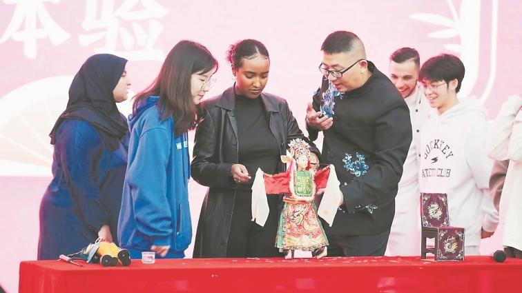福州外語外貿學院國際留學生近距離體驗鐵枝木偶戲的表演技藝。 “鐵枝龍”的傳承 6月21日,星期六,東山縣華福書苑,東山鐵枝木偶戲非遺公益普法體驗活動火熱開展。 省級鐵枝木偶戲非遺傳承人陳銀龍帶來1.26米高的“鐵枝龍”,一場關于“鐵枝木偶”說唱表演《包公明斷“高空拋物”》普法情景劇由此展開。