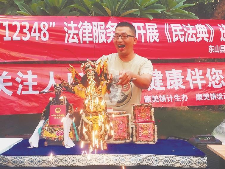 陳銀龍向來訪的小朋友展示木偶“吹泡泡”。何祖謀 攝 經過一年多的反復試驗,陳銀龍對木偶頭部進行技術改良,終于讓木偶噴火升級到4.0 版本:用冷煙火替代打火機。這一改進讓火勢在任何風力下都能收放自如,哪怕僅表演三四分鐘,也總能贏得滿堂喝彩。 “將噴火、變臉完美融入鐵枝木偶戲中,將古老技藝跟現代藝術融合起來,實現了木偶表演的多元化。”陳銀龍說。 近年來,微視頻發展勢頭迅猛。趁著這股“微”風,陳銀龍嘗試創作“木偶普法”普法微視頻,將法治宣傳拍成劇情版的普法微視頻,打造成為東山普法工作的一張響亮名片。 2020年6月初,陳銀龍獲知《社區矯正法》將于當年7月1日正式施行的消息。作為東山縣司法局普法宣傳員、東山“12348”法律服務隊志愿者,他迅速行動,希望借助視頻、網絡進行線上“木偶普法”。